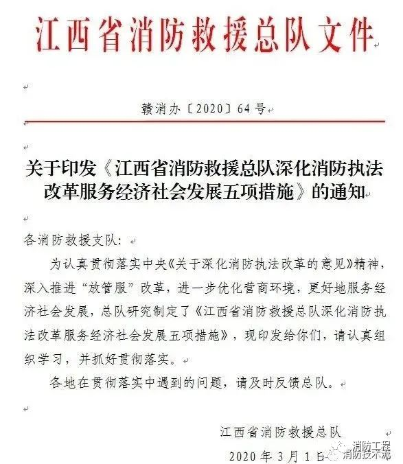 為認真貫徹落實中央《關于深化消防執(zhí)法改革的意見》精神,深入推進“放管服”改革,進一步優(yōu)化營商環(huán)境,更好地服務經濟社會發(fā)展,總隊結合工作實際,在全省推出深化消防執(zhí)法改革服務經濟社會發(fā)展五項措施: