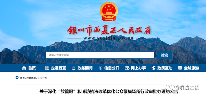 為持續(xù)深化“放管服”和消防執(zhí)法改革,認真貫徹落實國務院《優(yōu)化營商環(huán)境條例》(國務院令 第722號),大力提升便民利企服務,根據《寧夏回族自治區(qū)消防救援總隊 公安廳 文化和旅游廳 市場監(jiān)督管理廳 關于深化“放管服”和消防執(zhí)法改革優(yōu)化公眾聚集場所行政審批辦理的通知》(寧消〔2021〕117 號)文件要求,現(xiàn)將優(yōu)化公眾聚集場所行政審批辦理有關事項公告如下: